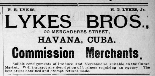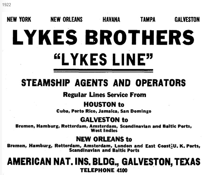In the early 1900s, Frederick and Howell Lykes, two of the seven sons of Dr. Howell Tyson Lykes, began shipping cattle to Cuba in a 109-foot wooden schooner, the Doctor Lykes. The Spanish American War had wiped out Cuba’s cattle herds and the brothers opened an office in Havana and began importing cattle. In 1903 a third brother, James McKay Lykes, opened an office in Galveston and began shipping Texas cattle.